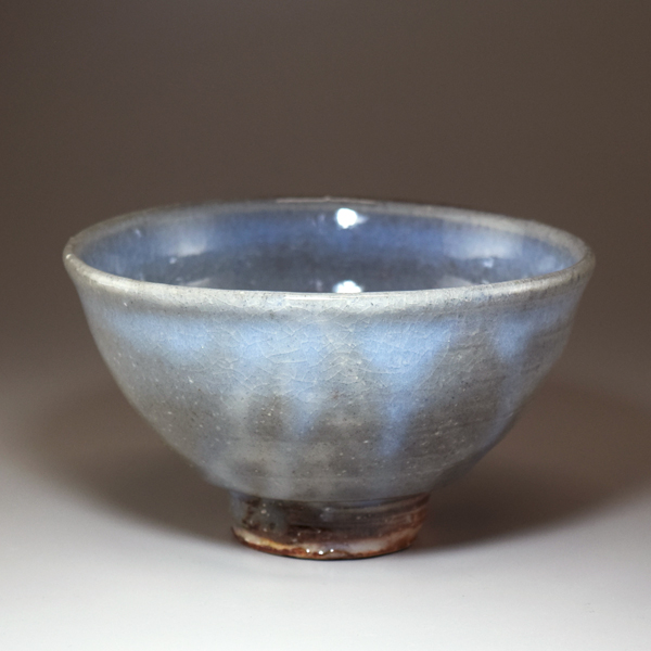 ブルーグレー色で、ところどころ赤色の現れた、美しい焼き色の井戸茶碗です。